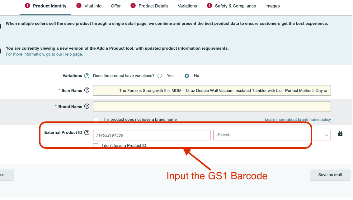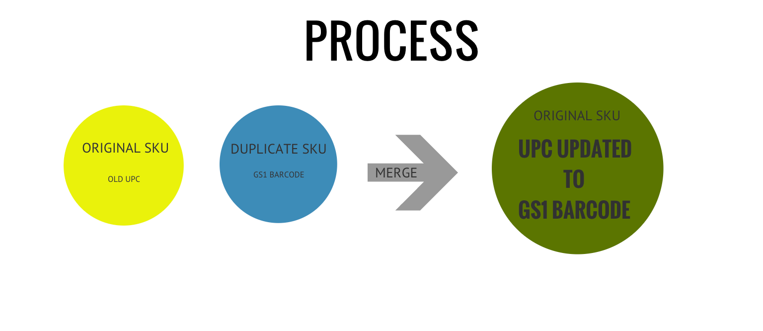 The process to update the UPC to GS1 barcode involves creating a duplicate listing that is exactly the same as the one you need to update the UPC for. After creating a duplicate copy of your original listing, you will need to merge them to attach the GS1 barcode to your listing.