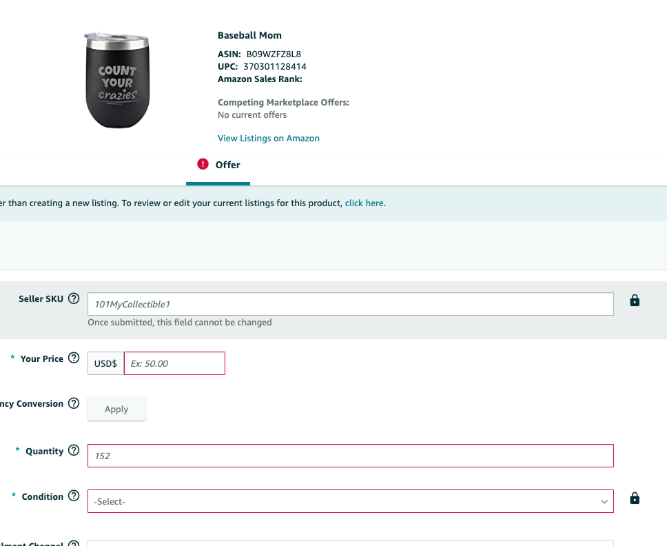 If you can see that there’s no UPC attached to it (Upper part), you can simply upload a flat file to update the UPC on the SKU.