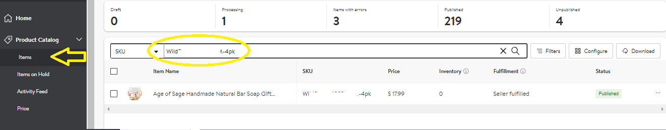 2. Go to Items under the Product Catalog and search for your item that needs to convert by SKU, Walmart item ID or name.