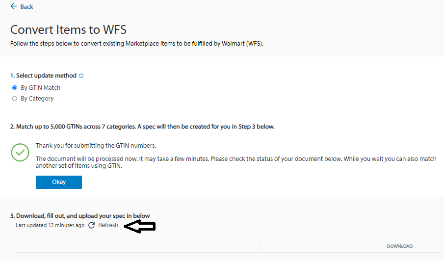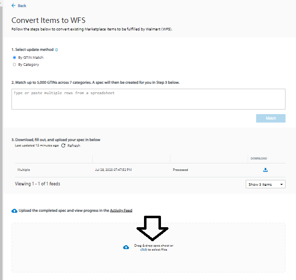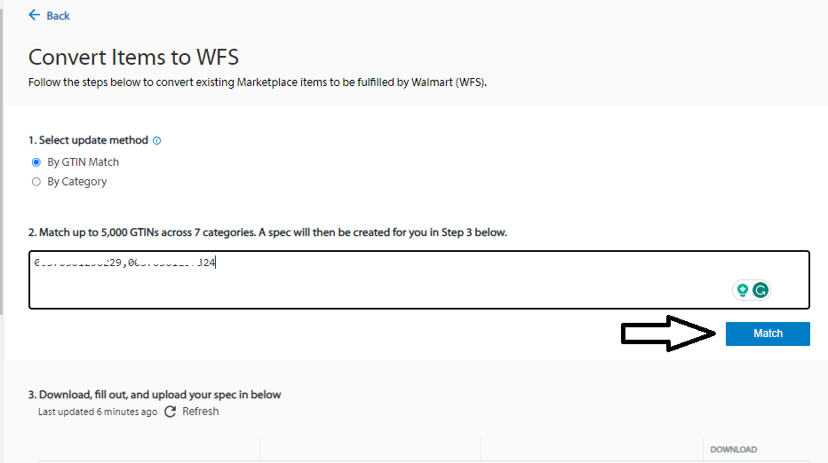 4. For the update method select By GTIN Match, by matching through GTIN, Walmart will populate the spec or template with information that’s already in the catalog, input the item GTINs in the box, and click the Match button.