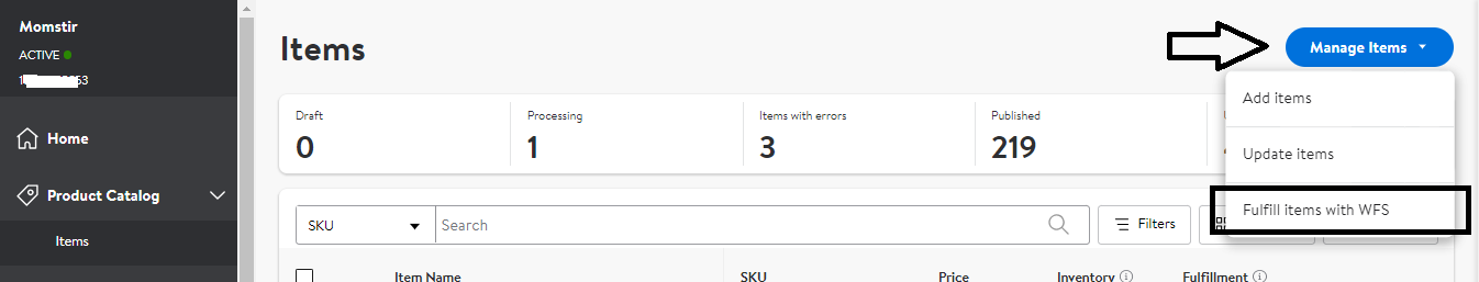 3. Click the Manage Items and select Fulfill items with WFS from the dropdown.