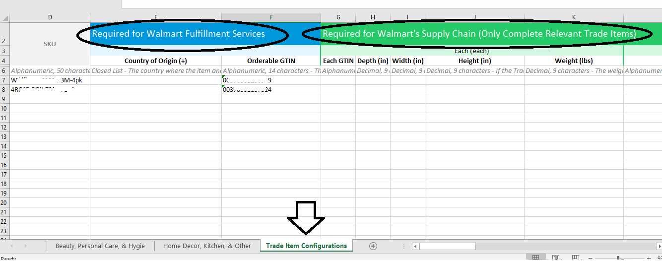 9. For Trade Item Configurations sheet, the required attributes are SKU, Country of Origin, Orderable GTIN, Each GTIN, and Dimension (Depth, Width, Height, Weight).