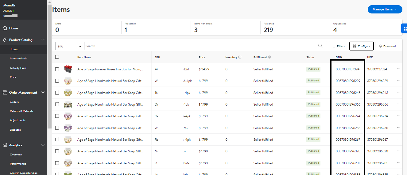 2. Go to Items under the Product Catalog. Determine the GTIN or UPC of the item that needs to be converted.