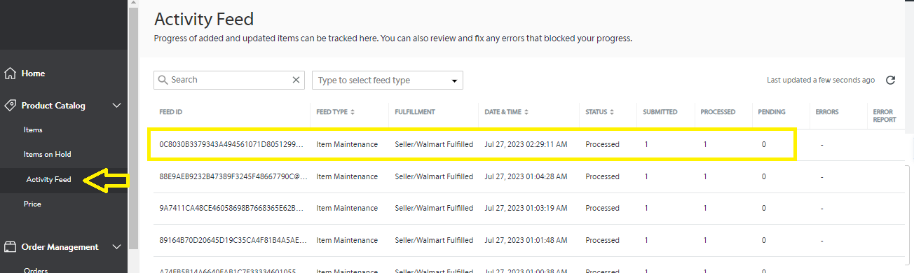 11. Click the Activity Feed under Product Catalog to monitor the upload and see if the new listing is successfully processed or if there is an error.