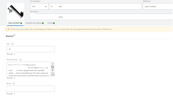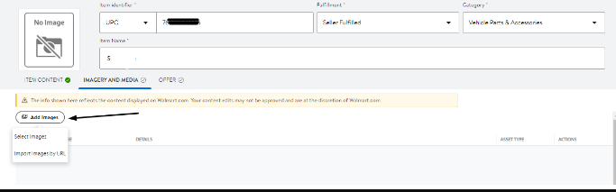 5. Once the mentioned attributes are supplied, complete the required information in ITEM CONTENT, IMAGERY & MEDIA, and OFFER sections.
