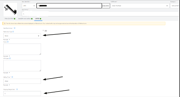 OFFER: Restriction Type (other categories do not require this field), Selling Price, and Shipping Weight (lbs).