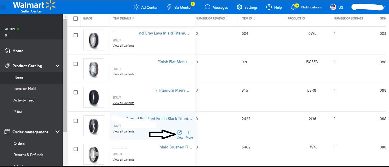 8. To verify if you have successfully created the listings. Go to Items under the Product Catalog, you should be able to see the new listings in this section in 5-10 minutes. Visit the product detail page to confirm if all information is correctly showing on the PDP. Hover the mouse over the listing and click View.