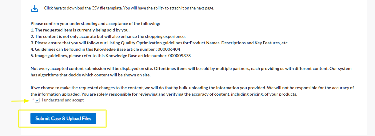 Once the CSV file is filled out SAVE. Go back to the case creation. Tick the I understand and accept check box. Click Submit Case, you will prompt to upload the CSV file and the ticket ID will show up.