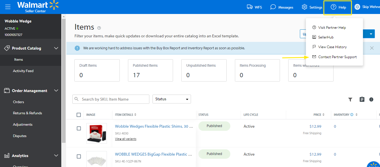- Click Contact Partner Support under the Help tab on the upper right corner of the main dashboard.
