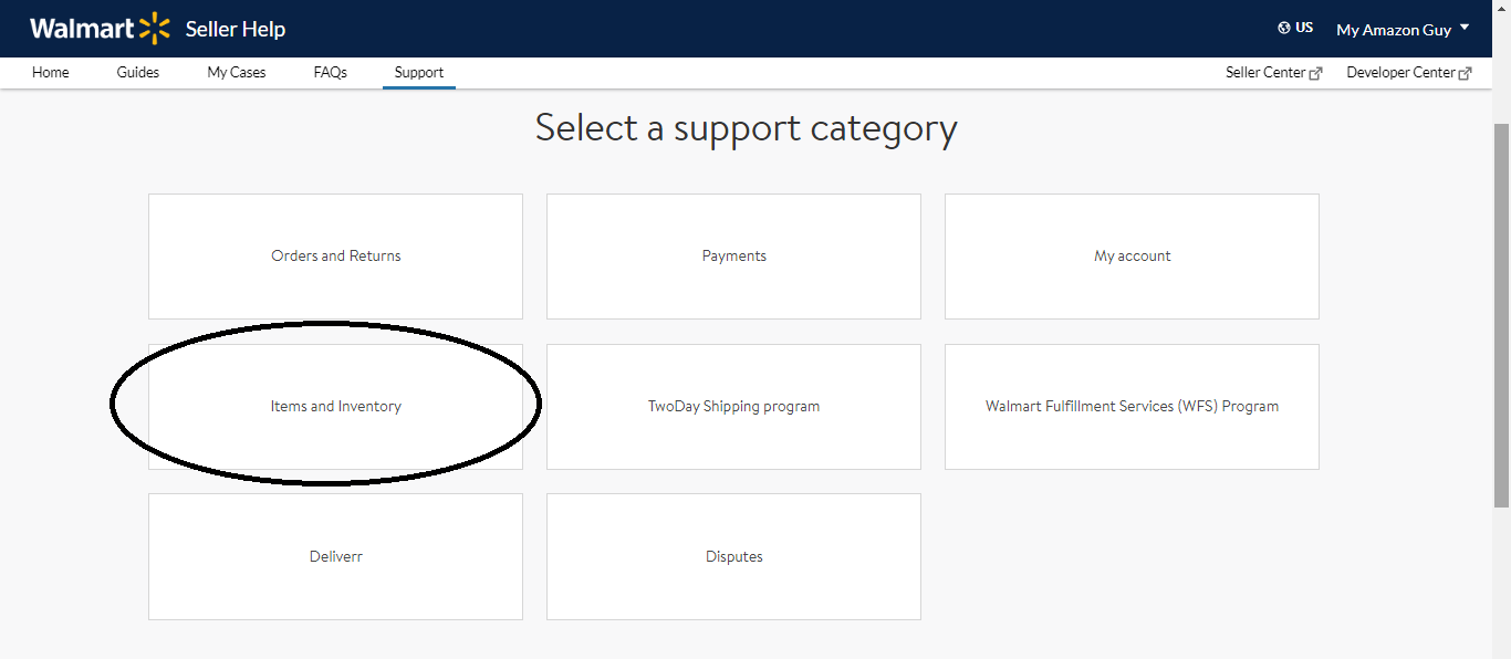 5. Choose Items and Inventory in the support category.