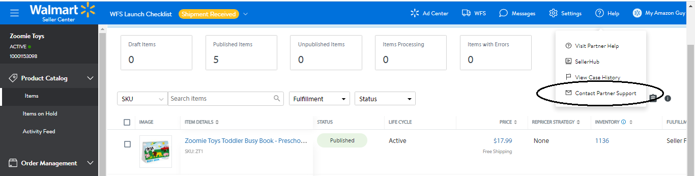 4. Contact help support. Click Help -> Contact Partner Support.