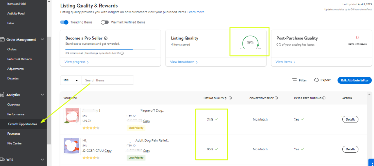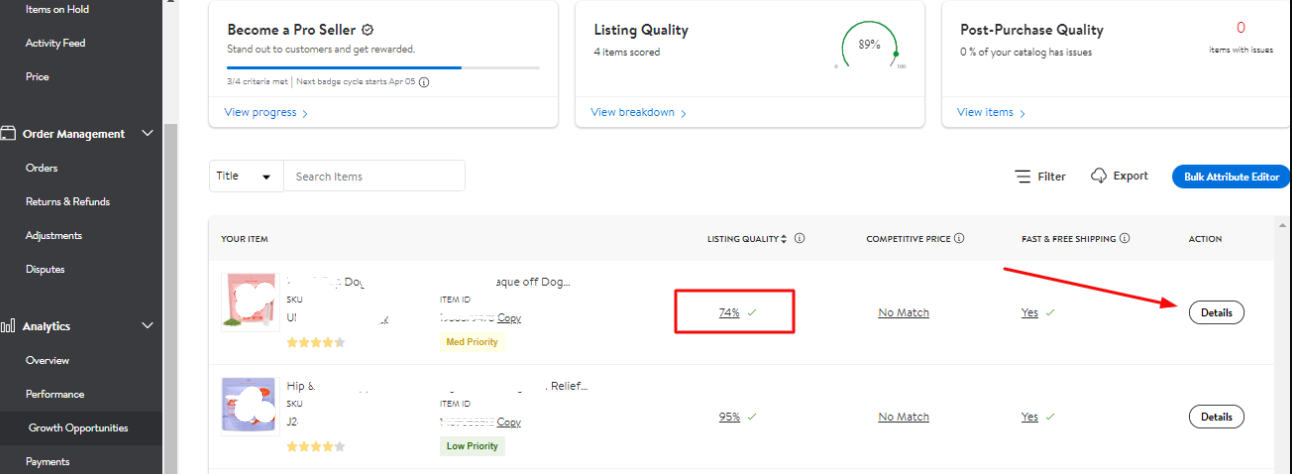 2. Go to Growth Opportunities under the Analytics. The goal is to get a 100% Listing Quality score for each and overall listings.
