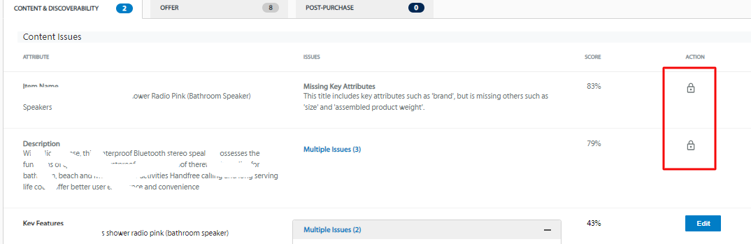 If you encounter locked attributes as shown in the image, this means the update to resolve the issues cannot be made and you need to reach out to the Walmart support team for assistance with the update.
