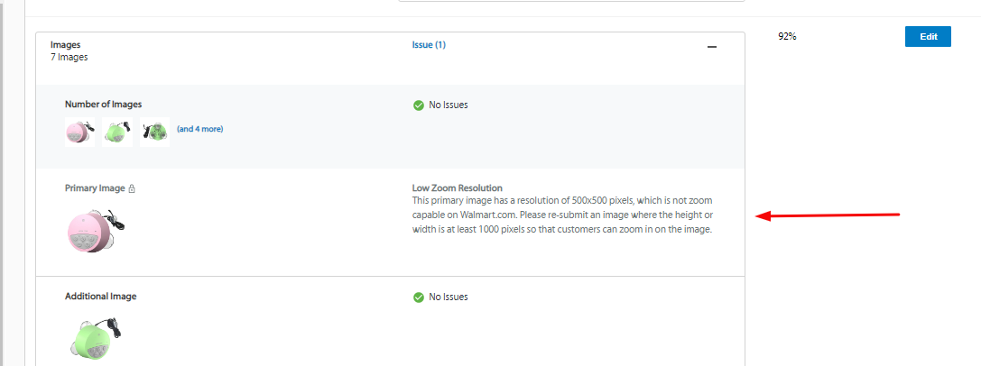 Check each tab to see which attributes do not have a 100% score. Fix issues accordingly and based on Walmart's suggestions.