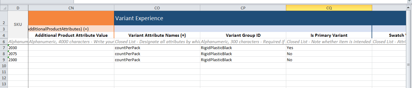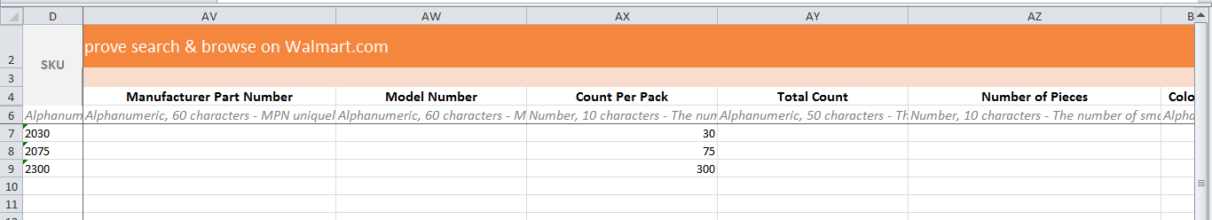 - Once the maintenance spec sheet is downloaded fill out the required attributes SKU, Product ID Type, Product ID, and supply values for these attributes