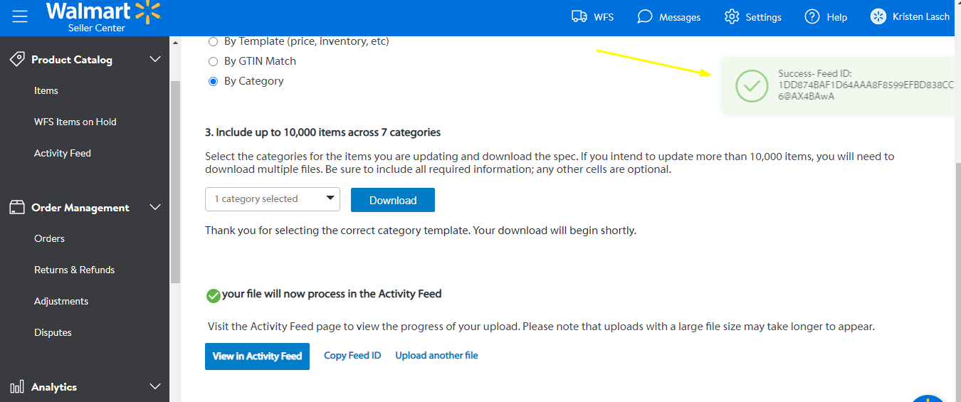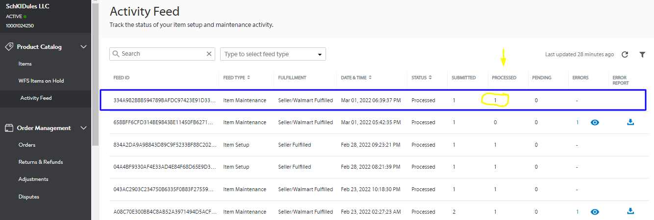 - Check the feed ID on the Activity Feed under Product Catalog to see if the update is successfully processed.